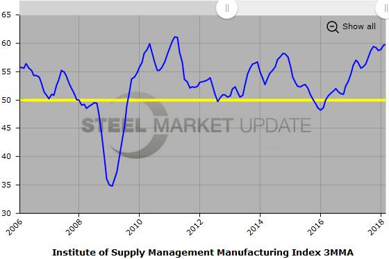 Below is a graph showing the history of the ISM Index on a three month moving average. You will need to view the graph on our website to use its interactive features; you can do so by clicking here. If you need assistance logging in to or navigating the website, please contact Brett at 706-216-2140 or Brett@SteelMarketUpdate.com.