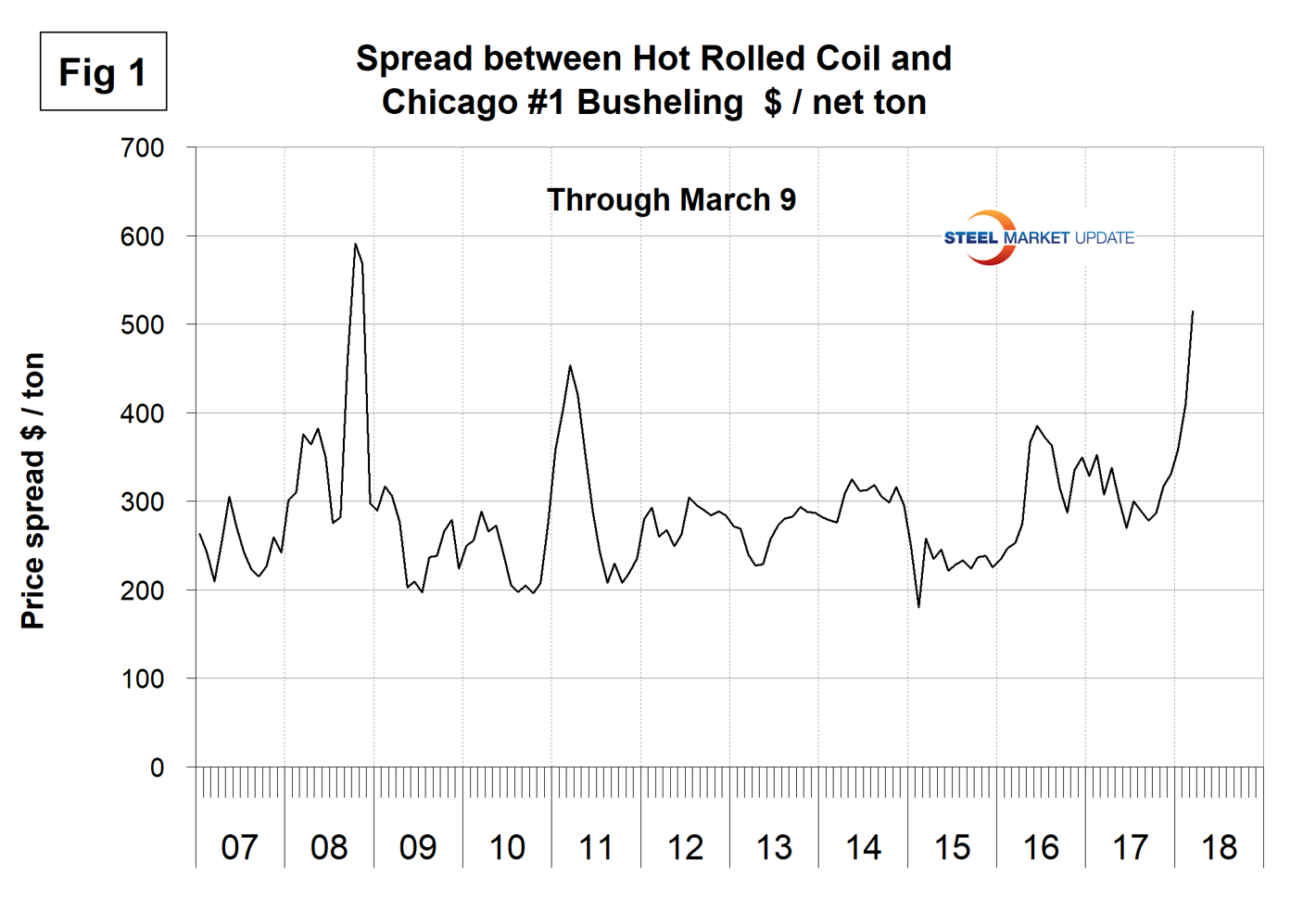 To put the raw materials analysis into perspective, we include here Figure 1, which shows the spread between Chicago #1 busheling and hot rolled coil ex works Indiana through March 9, both in dollars per net ton. March was the first time for the spread in dollars per net ton to exceed $500 since the wild ride of 2008. The spread has increased every month since September when it stood at $278.48.