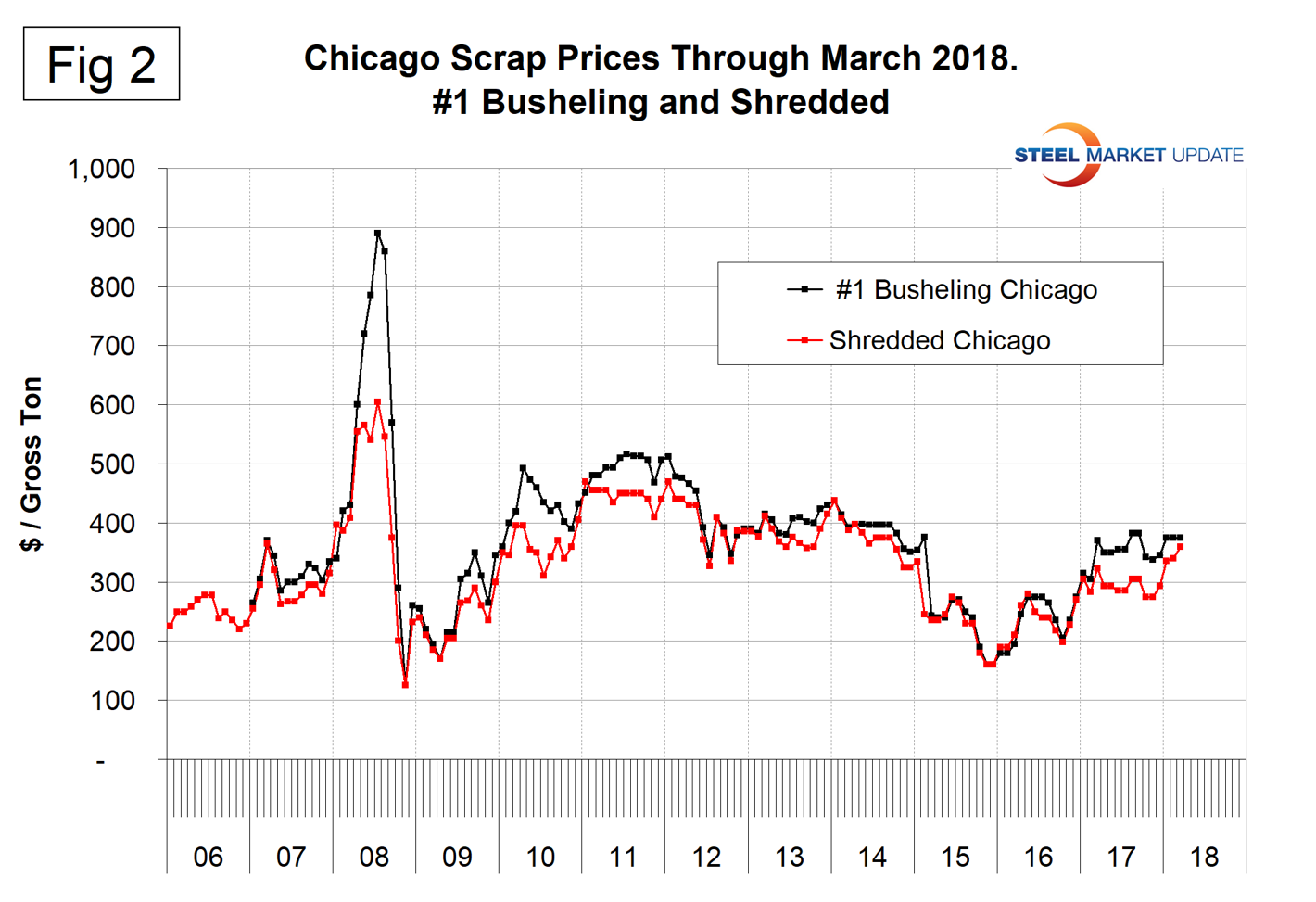 Figure 2 shows the relationship between shredded and #1 busheling both priced in Chicago. In March, shredded was $360.00 per gross ton, up from $275.00 in November 2017. Busheling rose from $337.00 in November to $375.00 in January and stayed at that level in February and March. The busheling premium was $15.00 in March, down from $77.50 in September last year.