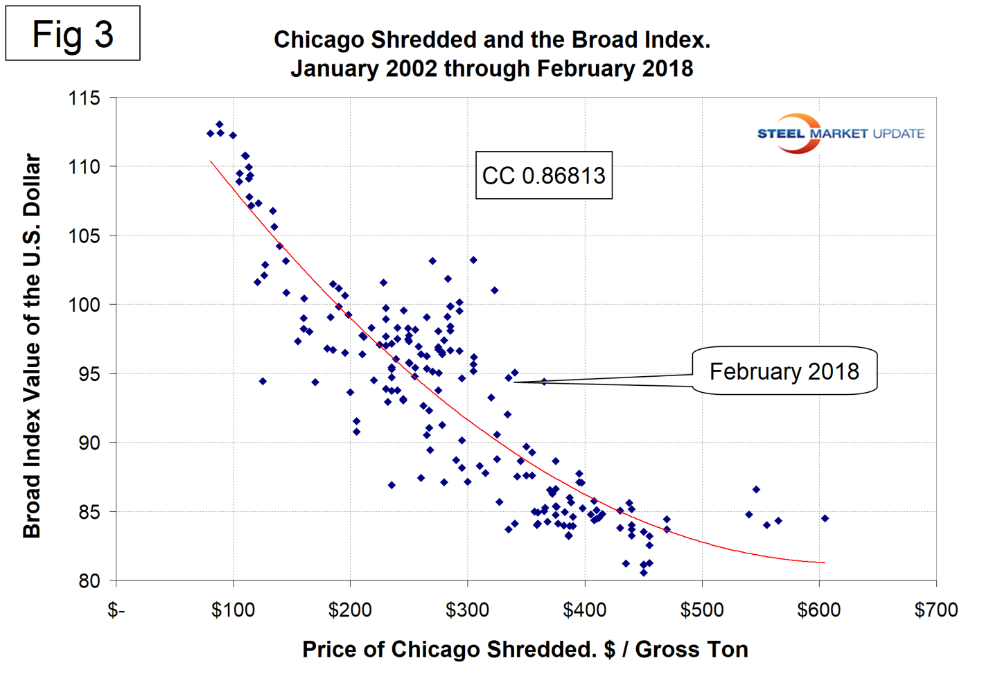 Figure 3 is a scatter gram of the price of Chicago shredded and the Broad Index value of the U.S. dollar as reported by the Federal Reserve. The latest data for the Broad Index was February. This is a causal relationship with a correlation of over 86 percent.