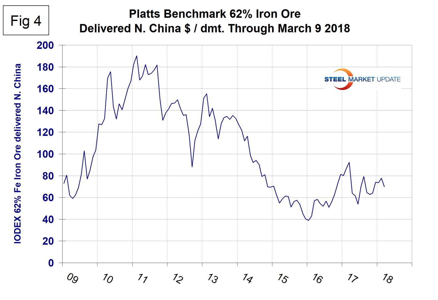 Beijing’s policies to clean up and consolidate the domestic steel industry are playing into the hands of iron ore exporting countries, reported Mining.com on March 8. High grade imported ore is preferable to China’s domestic, which requires beneficiation and sintering processes, both of which are polluters. Figure 4 shows the Platts IODEX of 62% Fe delivered North China since January 2009. The Index recovered to $92.30 on March 17, 2017, but had declined to $69.95 on March 9, 2018.