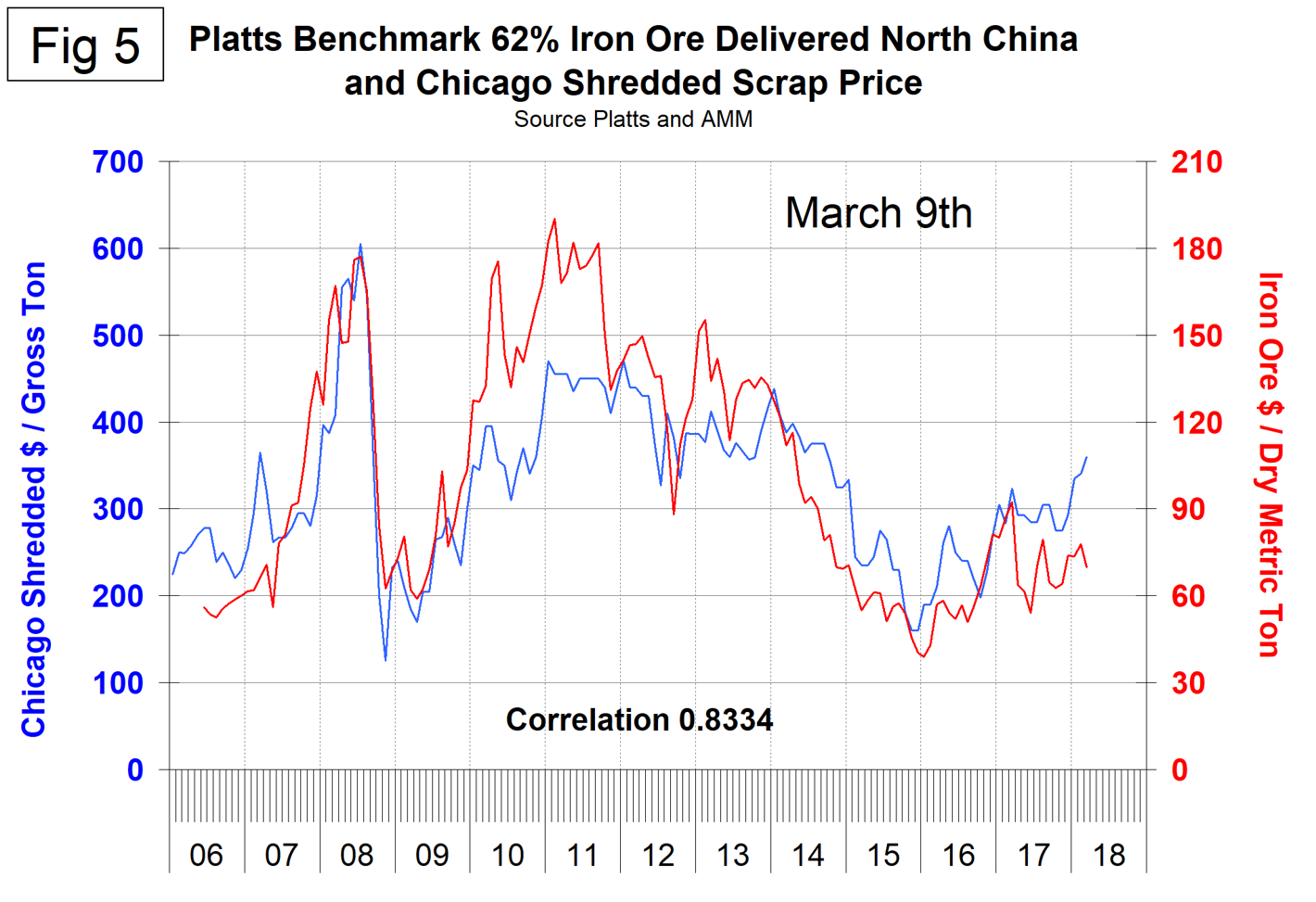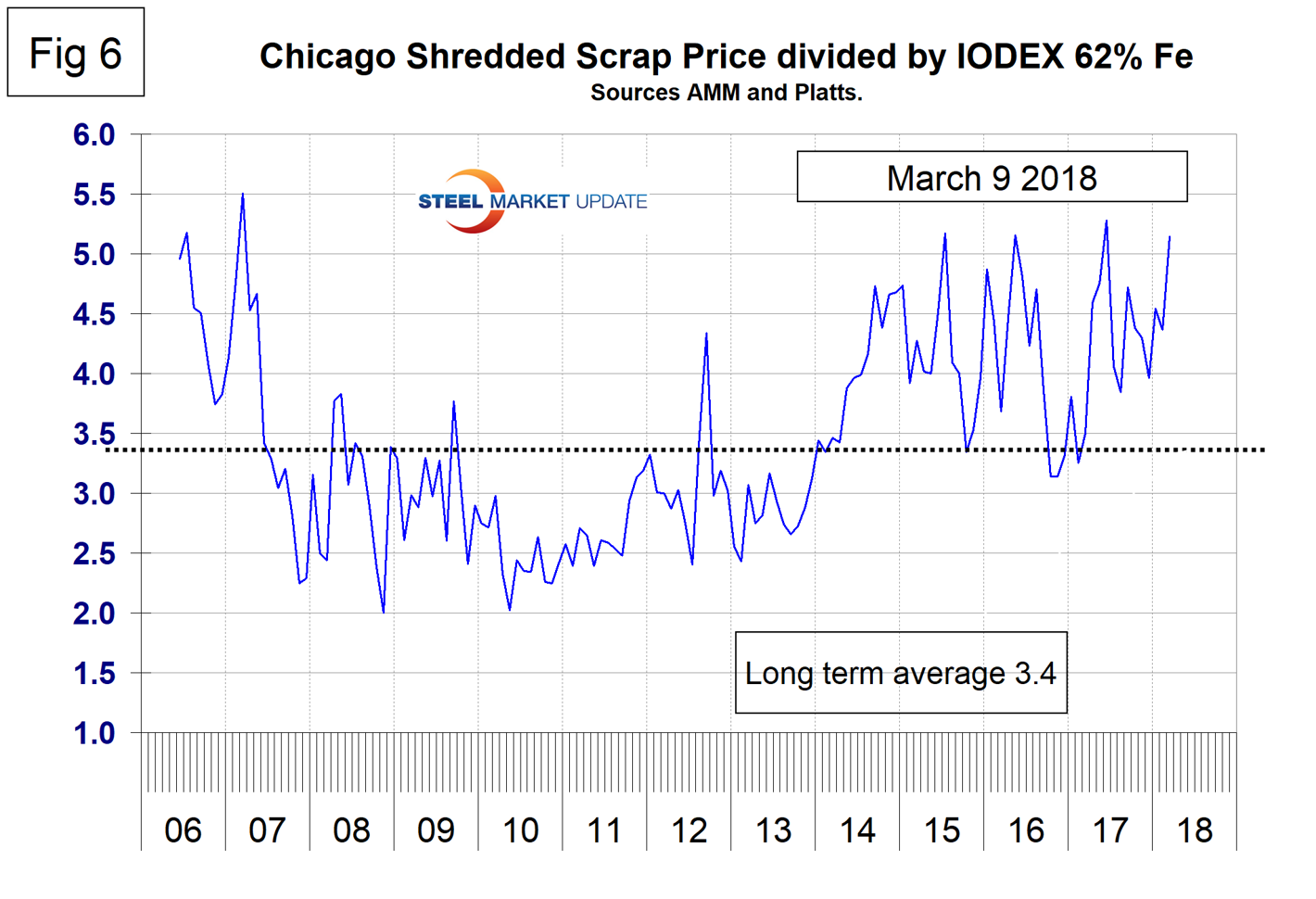 There is a long-term relationship between the prices of iron ore and scrap. Figure 5 shows the IODEX and the price of Chicago shredded through March 9.