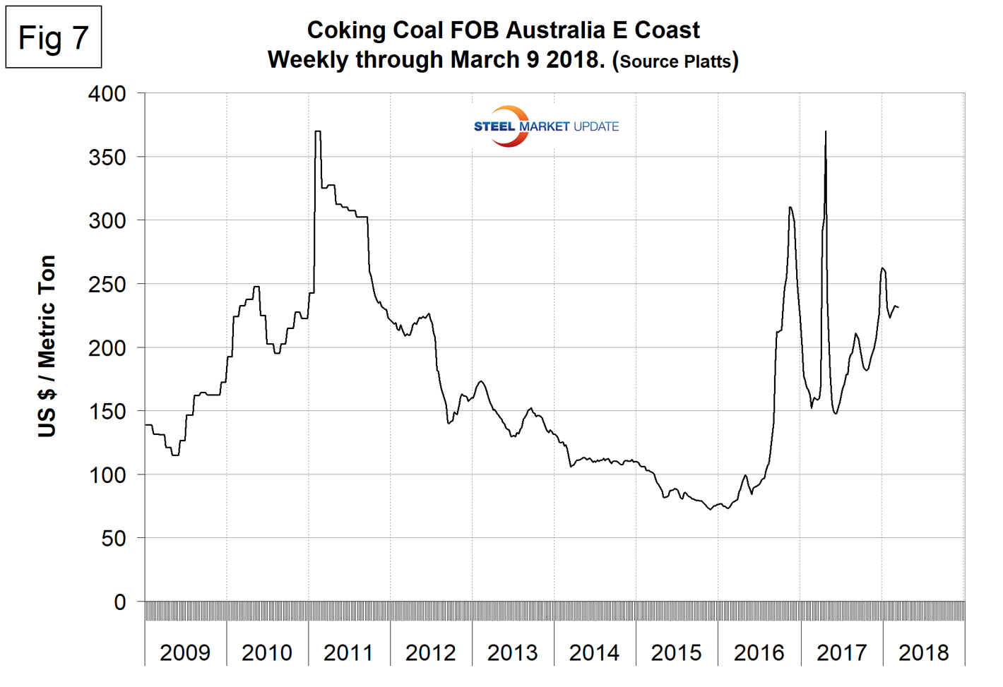 Coking coal prices have been highly erratic in the last 18 months. From mid-October 2017 to the end of December 2017, premium hard low volatile coking coal prices rose from $181.50 per metric ton to $262.25 FOB Australia’s East Coast (Figure 7). Since then the price has declined to $231.50 on March 9.