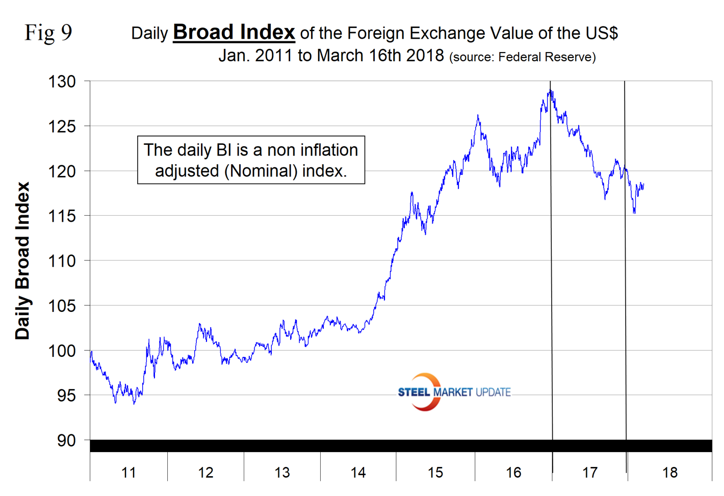 SMU Comment: There is an inverse relationship between commodity prices and the value of the U.S. dollar on the global currency markets. From Jan. 1 through March 16, the dollar was down by 8.1 percent, but since Feb. 1 has been trending back up again (Figure 9). A weakening dollar puts upward pressure on the price of those global commodities that are priced in dollars, as is clearly shown by the relationship between scrap and the dollar index described above.