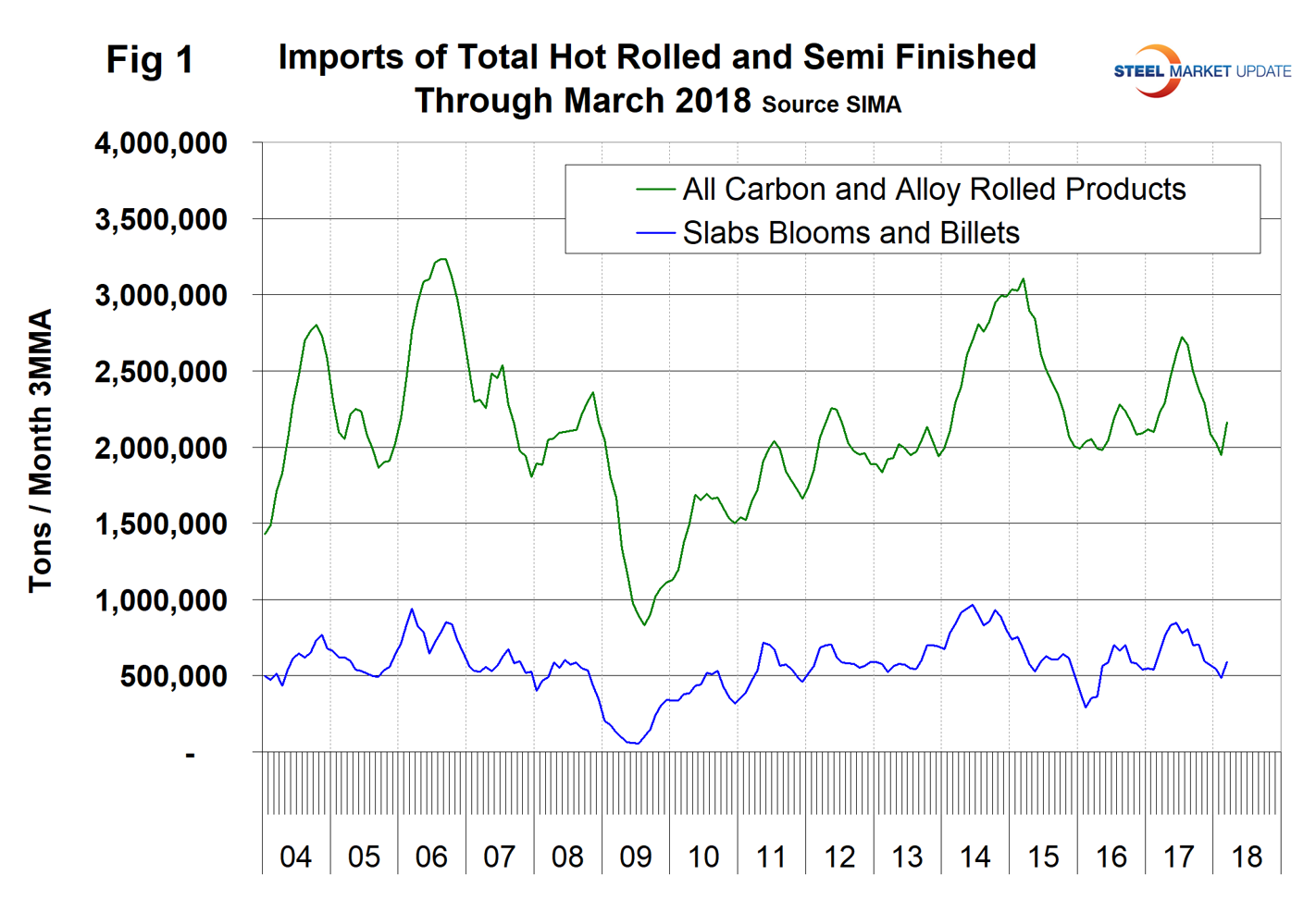 Figure 1 shows the tonnage of total rolled and semi-finished imports through March. The three-month moving average (3MMA) of total rolled product import volume in March was 2.2 million tons, up from 1.9 million in February but down from 2.7 million in July last year. The 3MMA of semi-finished imports in March was 590,000 tons, the highest since last November and up from 484,000 in February.