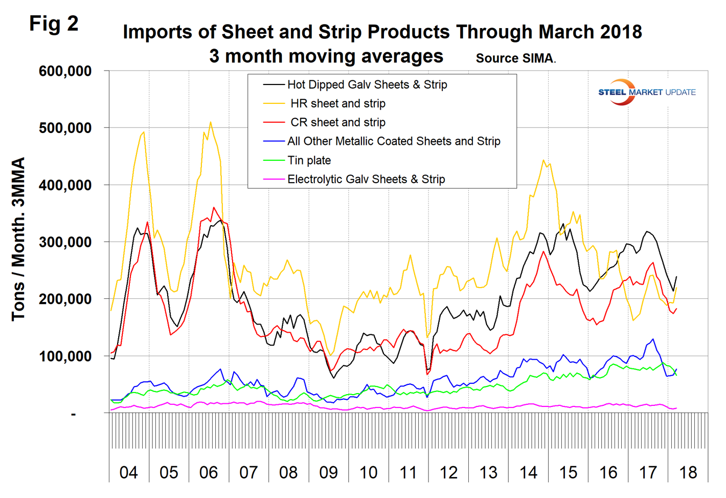 This is the third edition of our new and expanded import reports that now include all major steel sectors: sheet, plate, longs and tubulars, with a total of 18 subsectors. This month we have separate reports for flat rolled, long and tubular products. In addition, we now publish import market share analyses for the same 18 steel product groups. Together, these import reports plus the import share reports should give an accurate view of the effect of the Section 232 trade legislation. See the end of this piece for an explanation of the methodology. All volumes in this analysis are reported in short tons. We use three-month moving averages rather than single-month results to smooth out the variability.