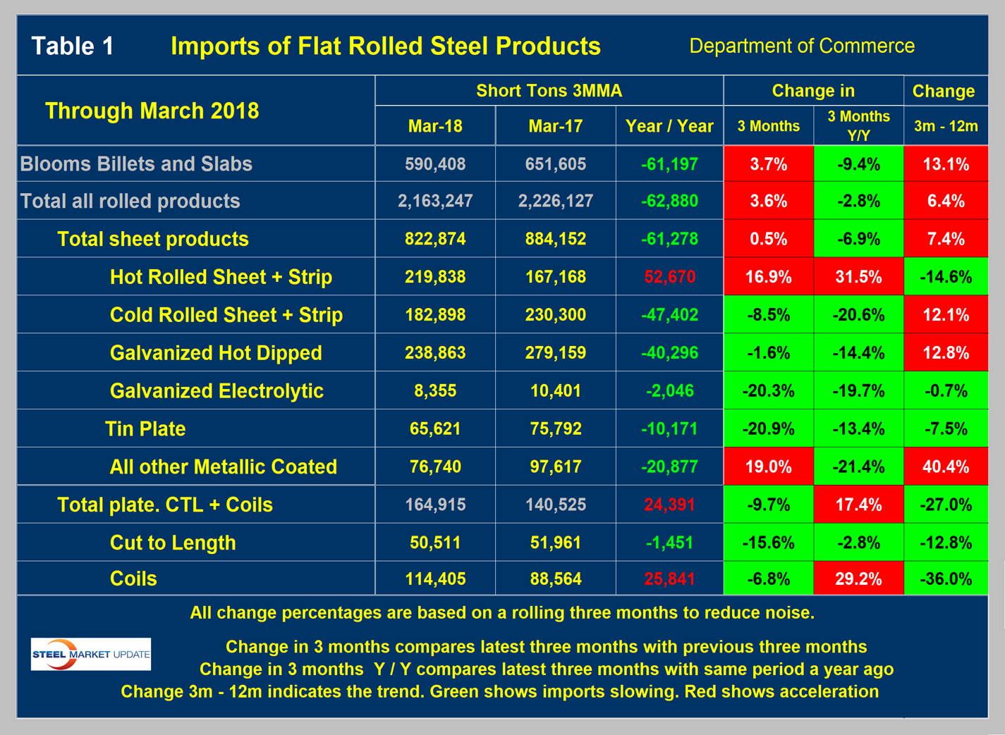 In Table 1 of this report, we show the 3MMA of the tonnage in March 2018 and 2017 with the year-over-year change. We then calculate the percentage change in volume in the most recent three months with the previous three months. This month we are comparing January/February/ March with October/November/December (3M/3M). The next column to the right shows the year-over-year change as a percentage. Declines are color coded green and increases are coded red. Finally, in the far-right column, we subtract the 12-month change from the three-month change. This is a way of describing the magnitude of the recent trend as a percentage. In some cases, even though imports are declining in both time frames, the trend is red meaning the decline is slowing.