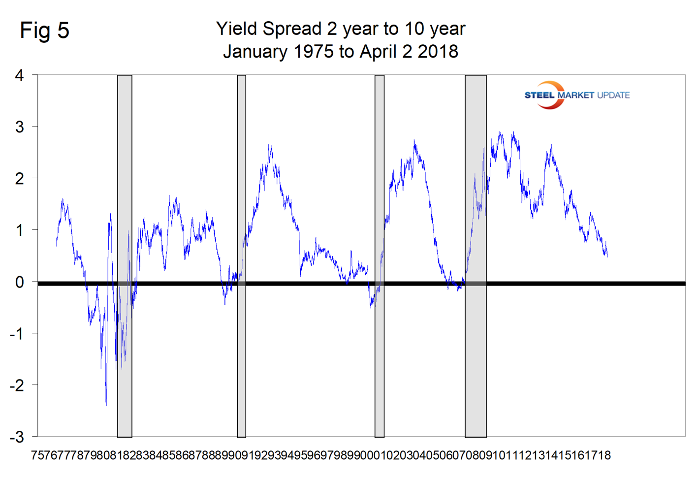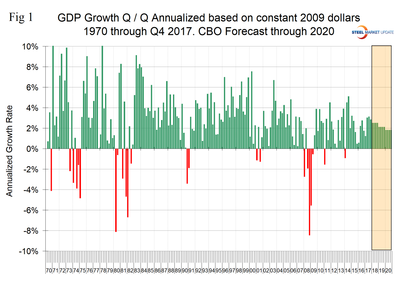 Figure 1 provides a history of U.S. recessions since 1970. Recessions occurred in 1974, 1980, 1981, 1990, 2001 and 2008. In Q4 2017, the latest data, the BEA reported the growth of GDP to be 2.87 percent.