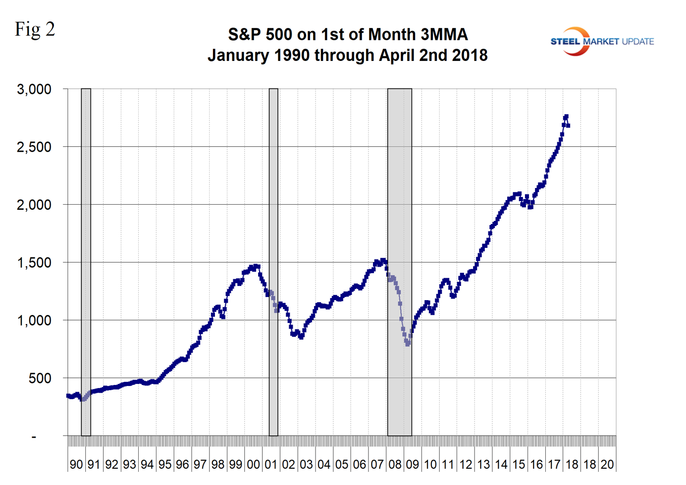 Figure 2 shows the three-month moving average of the S&P 500 on the first day of each month from January 1990 through April 2018. The stock market did predict the recession of 2001, but failed in 2008.