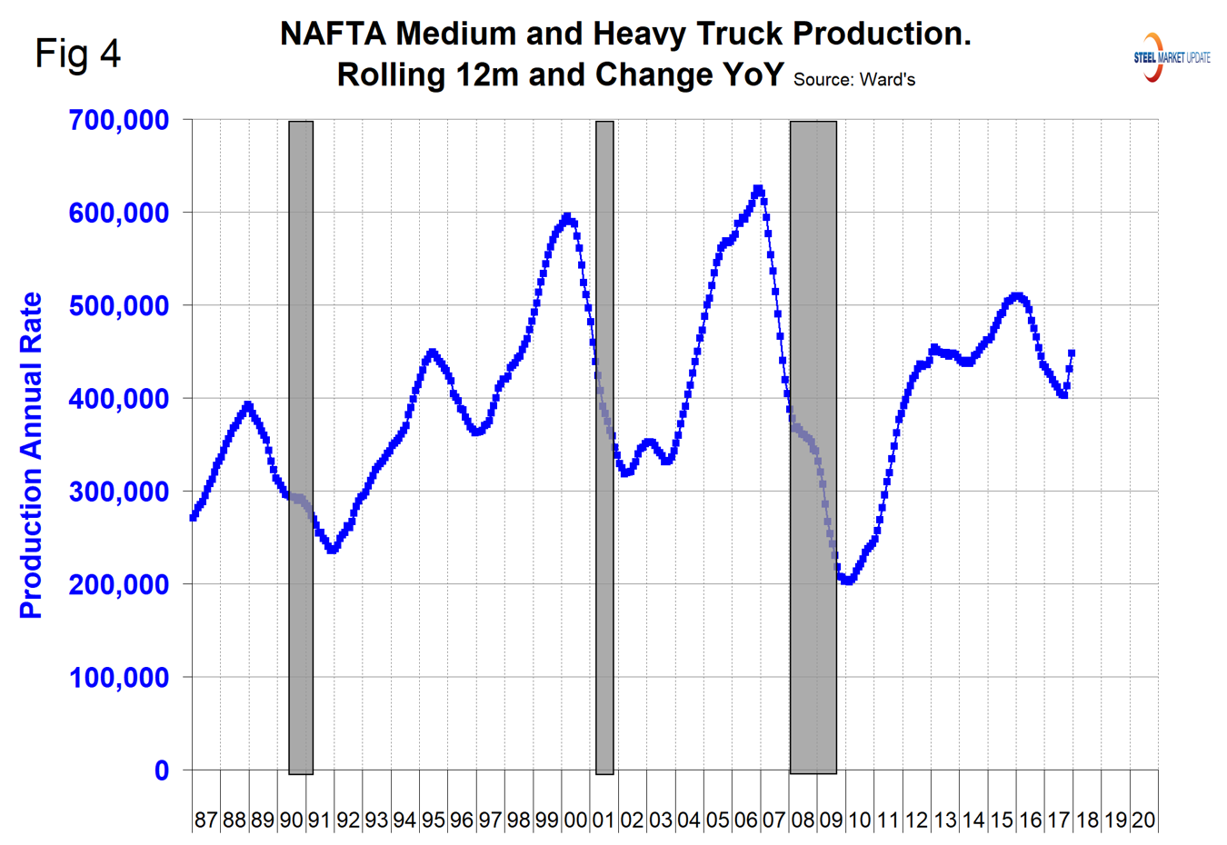 Figure 4 shows monthly assemblies of medium and heavy trucks in NAFTA. Evidently, the auto companies’ economists have a good read on future business activity. They correctly anticipated and acted in advance of the 1990, 2001 and 2008 recessions. They were nervous in 1995 and 2016, which turned out to be false alarms. This illustrates our belief that we need to be cognizant of all these indicators simultaneously to get the best view of the future.
