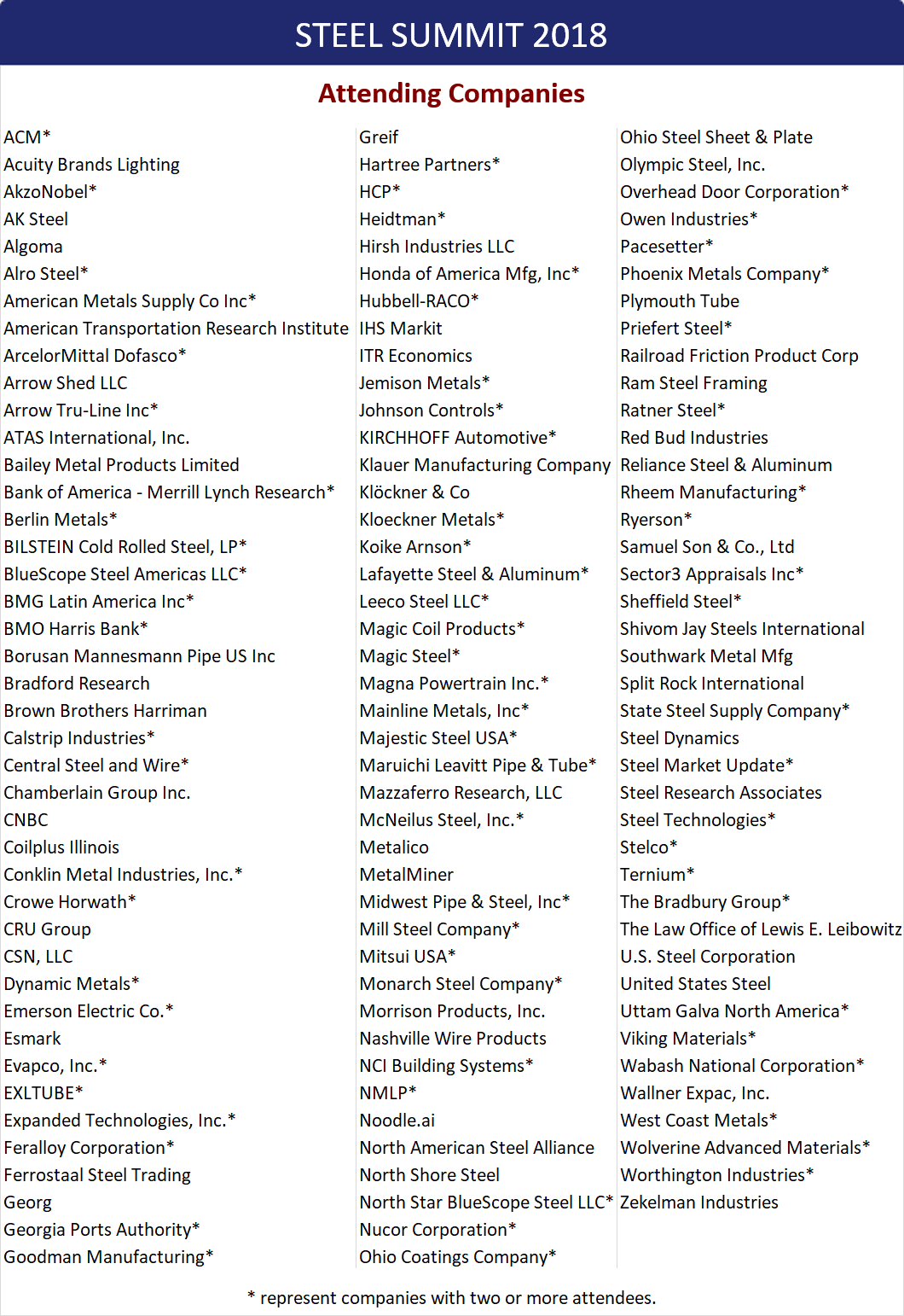 Registrations for the 2018 SMU Steel Summit continue to come in at a steady pace. It took us until May 9 last year to reach the number of registrations that we already have as of the beginning of this week. There are 110 companies registered and we still expect 300 companies and 800 executives to fill the Georgia International Convention Center on Aug. 27-29. A SMU Steel Summit is a special experience for anyone involved with the steel industry, be it manufacturing/fabrication, distribution, production, trading, logistics, toll processors and all of the companies that service the industry. Tonight we are including a listing of the companies registered so far (those with an asterisk * means more than one executive will be attending). This is the premier conference to meet decision makers, meet new prospects/suppliers and to learn a great deal about the economy, the industry and the challenges/opportunities facing the industry.