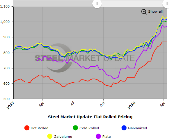 SMU Note: Below is a graphic showing our hot rolled, cold rolled, galvanized, Galvalume, and plate price history. This data is available here on our website with our interactive pricing tool. Note that plate prices are not yet available on our website, but we are in the process of adding that dataset. If you need help navigating the website or need to know your login information, contact us at info@SteelMarketUpdate.com or 800-432-3475.
