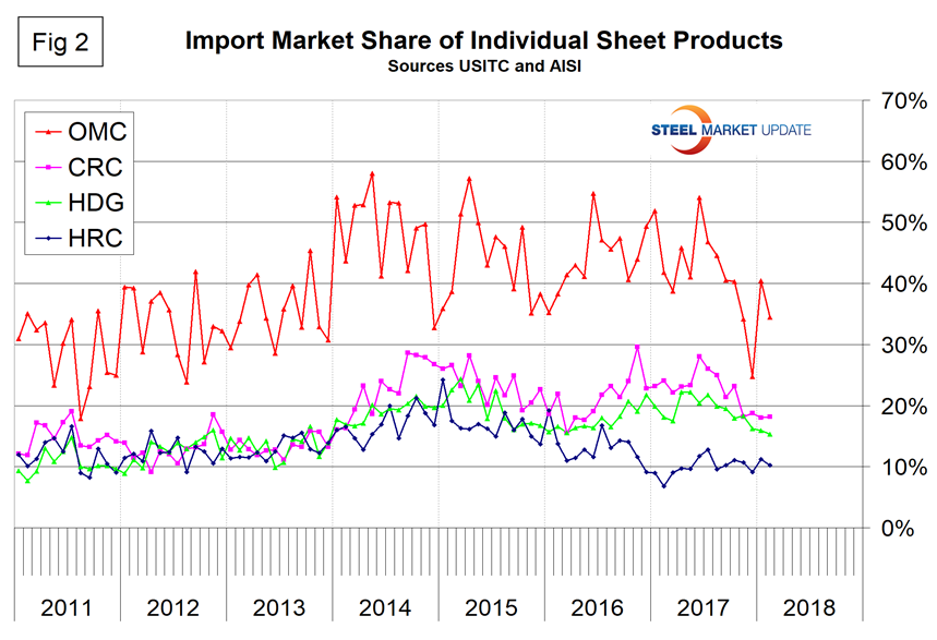 Figure 1 shows the historical import market share of plate and total sheet products. The import share of both has been decreasing for three years, though more so for plate which started at a higher level.