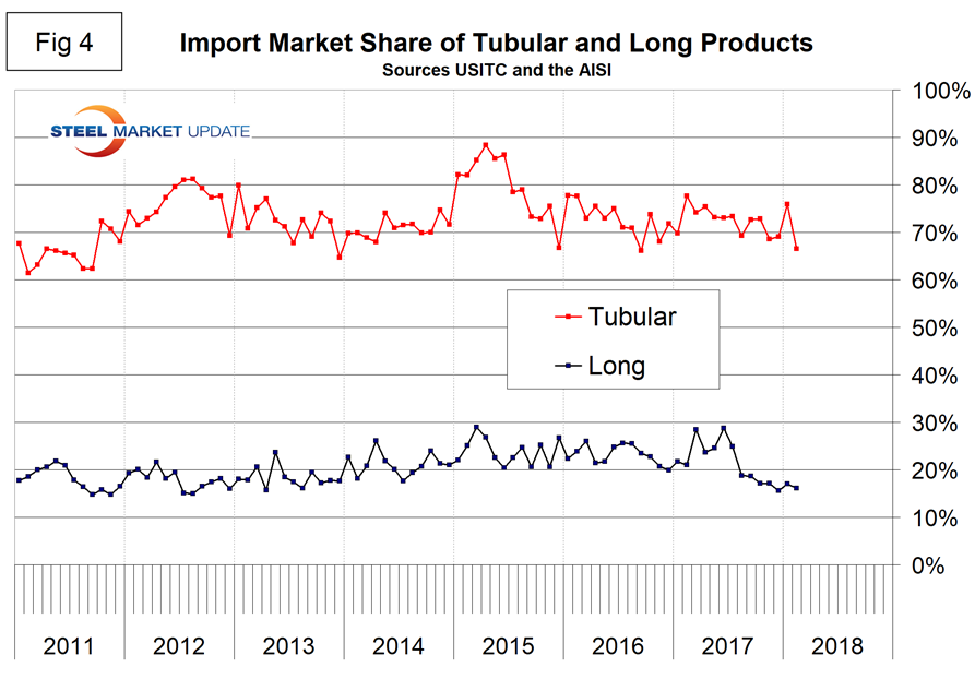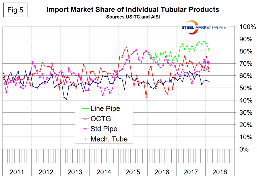 Figure 4 describes the total import share of tubular goods and long products. Imports of tubular goods have by far the highest market share of any product group. We are not impressed with the quality of the AISI data for tubular goods, probably because this is a more fragmented supply chain and the independent tubers aren’t reporting to the extent that the steel mills do for other products. Therefore, we don’t include structural tubing in Figure 5 and line pipe only starts in 2016. It does appear that this data is improving with time and that the numbers post March 2017 are believable. The import share of long products has decreased by almost 50 percent since June last year.
