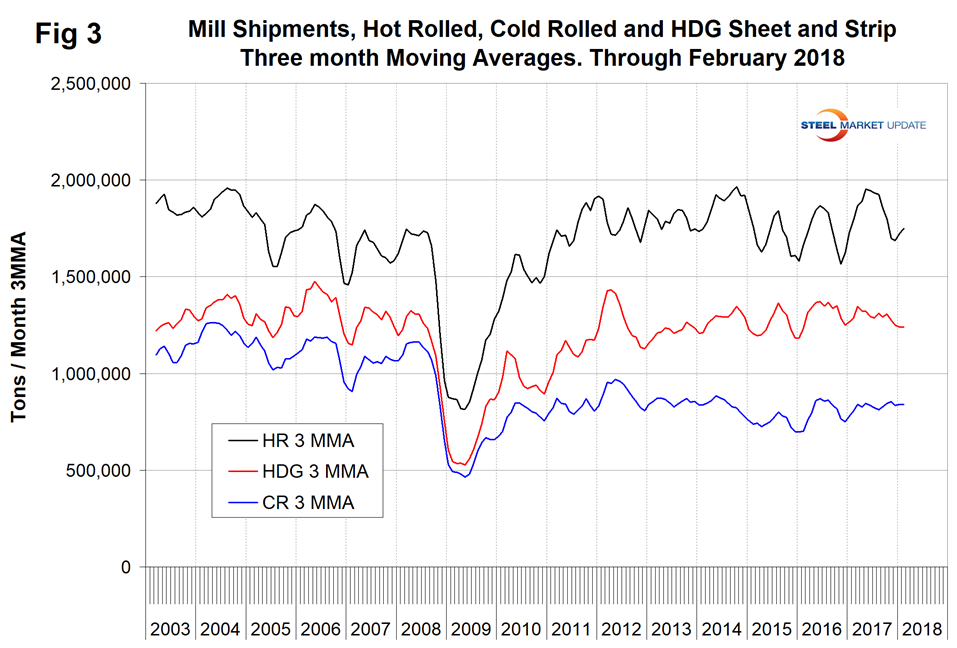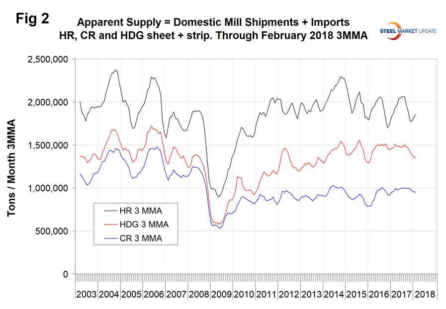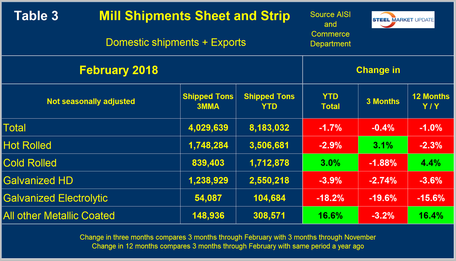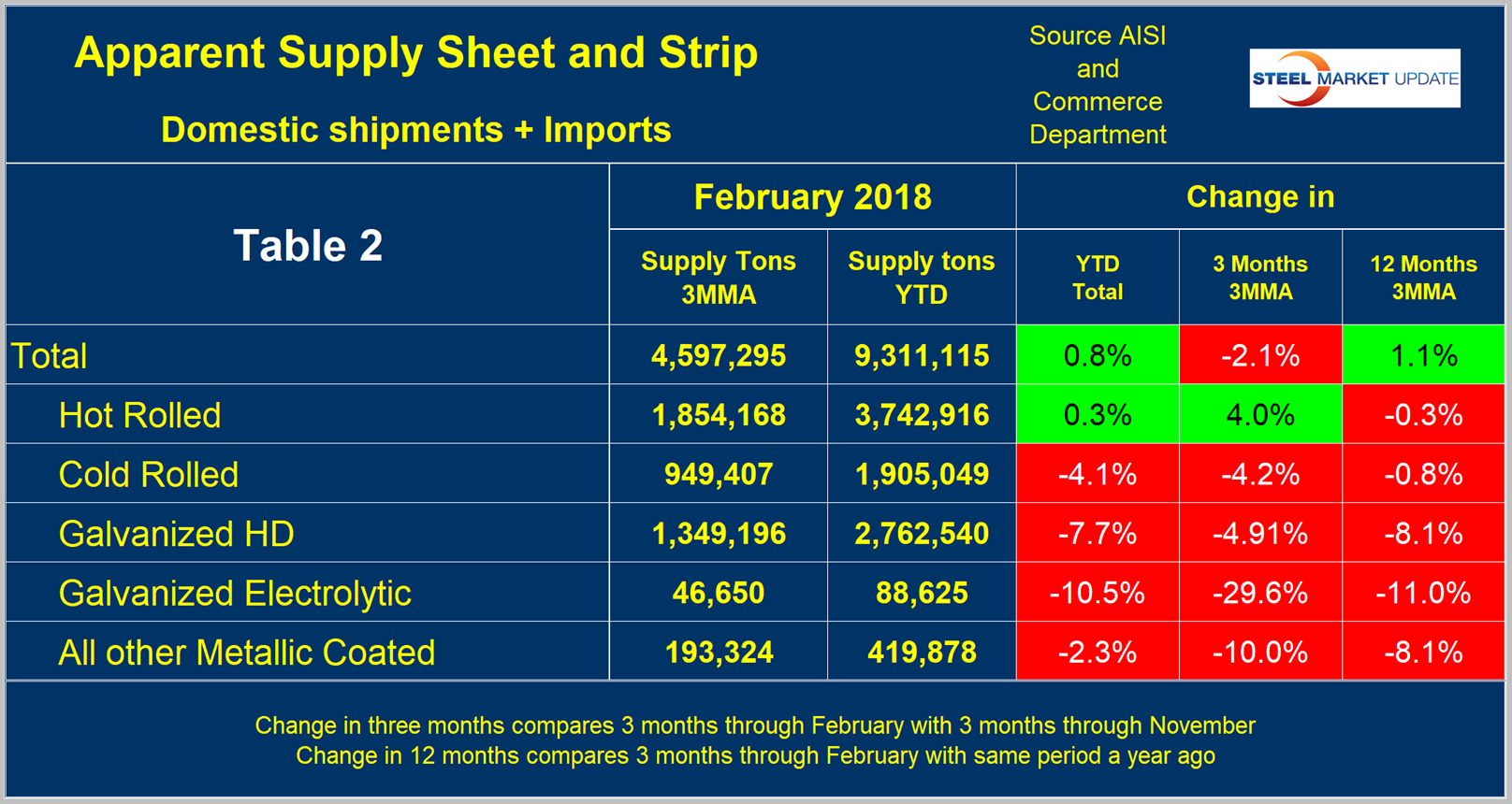 Apparent supply is defined as domestic mill shipments to domestic locations plus imports. In the three months through February 2018, the average monthly supply of sheet and strip was 4.597 million tons, up by 0.8 percent year to date but down by 2.1 percent in the three months through February compared to three months through November. There is no seasonal manipulation of any of these numbers. By definition, year-over-year comparisons have seasonality removed, but 3M/3M comparisons do not. Table 2 shows the change in supply by product on this basis through February.