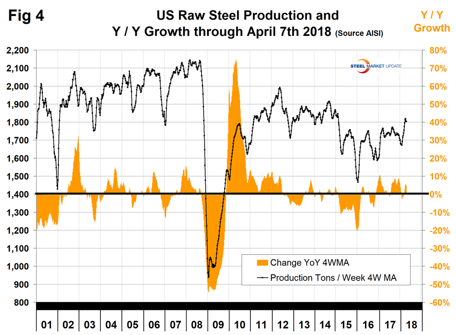 SMU Comment: One problem with this data is that it’s now well into April and the latest information we have for shipments and supply is for February. AISI puts out weekly data for crude steel production, the latest for which was the week ending April 7. This provides the most current data for steel mill activity. Figure 4 shows the year-over-year change in weekly crude output on a four-week moving average basis. Growth became positive year-over-year in the week ending July 15, 2017, and was greater than 5.0 percent every week from July 29 through Dec. 23. Growth became briefly negative from mid-January through the end of February 2018, which shows up in the data through February described above. Based on the strength of the economic indicators analysis that SMU performs and our proprietary measure of buyer sentiment, we are expecting demand for sheet products to increase in the first half of 2018.