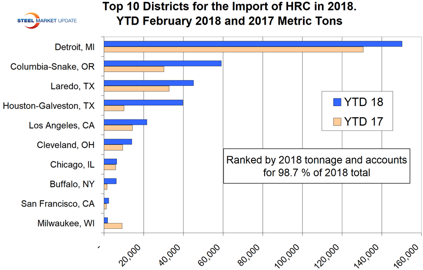 The table included here (click to enlarge) is a small part of the detailed analysis of the hot rolled tonnage. The bar graph shows the tonnage of HR that entered the top 10 districts in YTD February for 2017 and 2018 ranked by 2018 tonnage. These 10 districts account for 98.7 percent of the YTD total in 2018. Detroit had the most tonnage through February followed by Columbia Snake, Laredo and Houston.