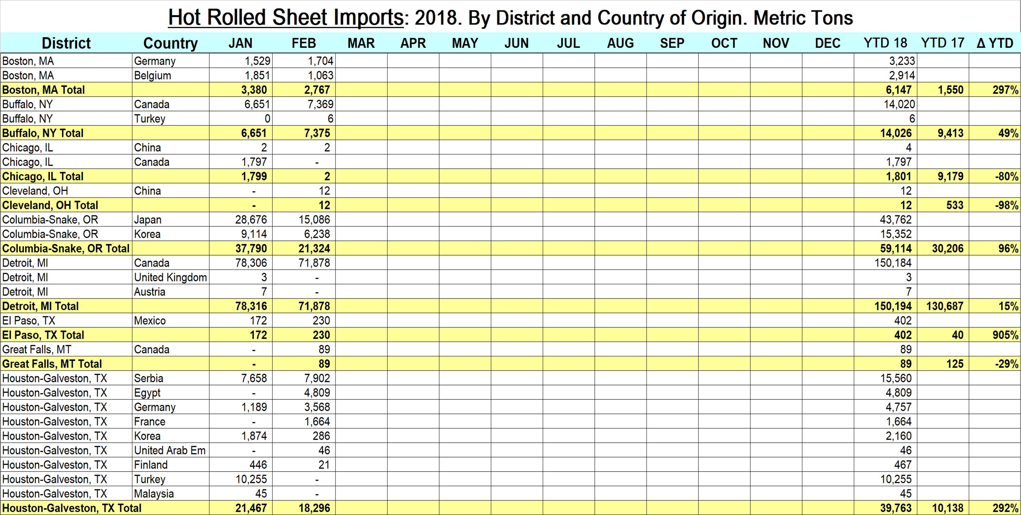 Premium members will find reports here on our website that break down the import tonnage through February into the port of entry and country of origin in metric tons. Products analyzed in this way are HRC, CRC, HDG sheet, OMC sheet, CTL plate and coiled plate. This data set is large; therefore, we will make no attempt to provide a commentary. Each reader’s interest will be different and he or she simply needs to select one of the six products, then find the nearest port or ports of entry to see how much came into the region each month and from where. Monthly data is provided back to January 2015. It is clear from these detailed reports that the change in tonnage entering a particular district in many cases is completely different to the change in volume at the national level.