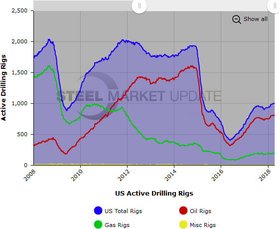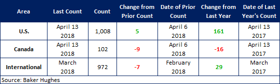 The U.S. rig count, an indicator of oil country tubular goods demand, rose this week, according to April 13 data from oilfield services company Baker Hughes. The number of active U.S. drill rigs rose by 5 to 1,008 rigs, with oil rigs up 7 to 815 rigs, gas rigs down 2 to 192 rigs, and miscellaneous rigs unchanged at 1 rig. Compared to this time last year, the 1,008 count is up 161 rigs, with oil rigs up 132, gas rigs up 30, and miscellaneous rigs down 1. See the first graph below for a history of active U.S. rig counts.