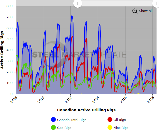 The Canadian rig count continues to slide downwards. This past week, the count fell 9 to 102 rigs, with oil rigs down 7 to 41 rigs, gas rigs down 2 to 61 rigs, and miscellaneous rigs unchanged at 0. Compared to last year, the 102 count is down by 16 rigs, with oil rigs up 1, gas rigs down 17, and miscellaneous rigs unchanged. See the second graph below for a history of active Canadian rig counts.