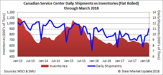 The daily average receipt rate for March was 19,033 tons per day, up from 18,905 in February. Total March steel receipts were 399,700 tons, up 21,600 tons over February. According to MSCI, total steel product inventories in Canada stood at 2.6 months at the end of March, down from 3.0 months in February.
