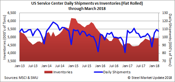 U.S. service centers shipped 3.596 million tons of steel products in March, a decrease of 1.7 percent from March 2017, but an increase of 9.3 percent from February. U.S. service center inventories at the end of March totaled 7.783 million tons or 2.2 months on hand. That’s a 7.9 percent increase from the 7.214 million tons in inventory, and up from 2.0 months on hand, in March last year. Tons shipped per day in March totaled 163,400, down from 164,400 in February and 159,000 in March 2017.