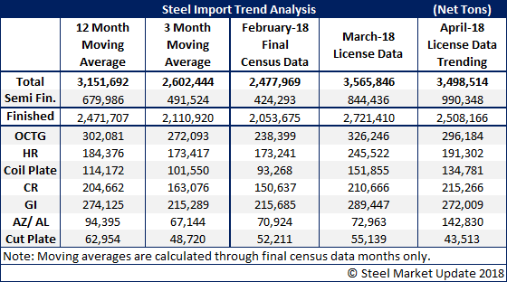 The U.S. Department of Commerce updated their license data for the months of March and April, and we now have data through April 17. Based on the data just released, both March and April appear poised to come in around 3.5 million net tons. The largest importers continue to be the domestic steel mills as they are the only ones that import semi-finished steels (slabs and billets), which are then rolled into sheet, longs or pipe and tube products.
