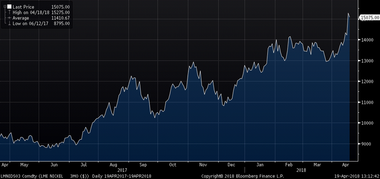 This week, nickel prices started going vertical on growing fears a fresh round of sanctions against Russia in response to the latest chemical attack in Syria could affect nickel in the same way it has aluminum.