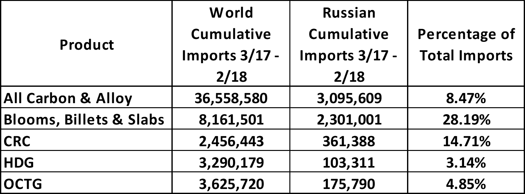 The table below shows the short tons imported in the most recent 12 months from March 2017 through February 2018 (Dept. of Commerce). About 28 percent of slabs imported into the U.S. were from Russia. During this period, Russia accounted for 8.5 percent of U.S. carbon imports and 15 percent of CRC imports. Keep in mind, this is just for the USA.