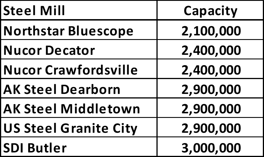 To give perspective on the size of this potential supply disruption, below is a list of domestic steel mills with annual flat rolled production close to Russia’s cumulative carbon imports.