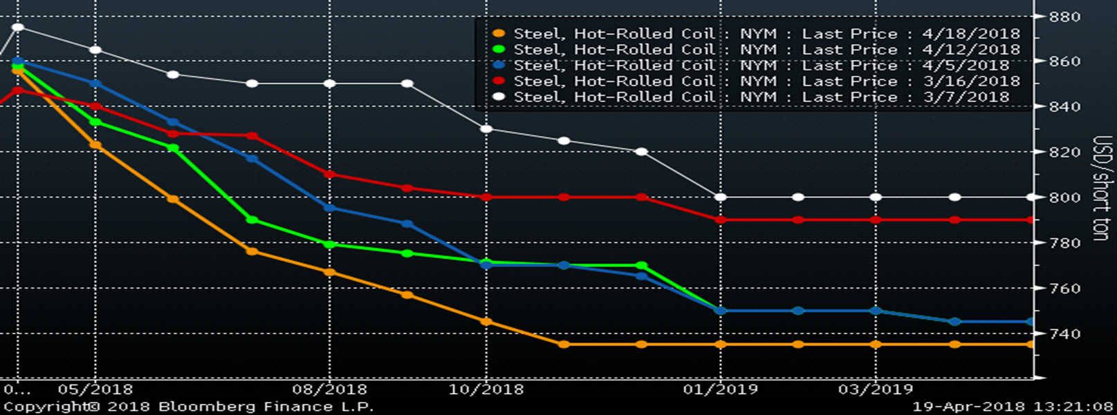 The Midwest HRC futures have been under pressure, now sitting at their lowest level since peaking on March 7. The market has yet to reflect this risk or a number of other very real upside risks still affecting the domestic flat rolled market. The market seems complacent that the recent influx of import orders will resolve the supply constraints of the 232 tariffs and quotas.