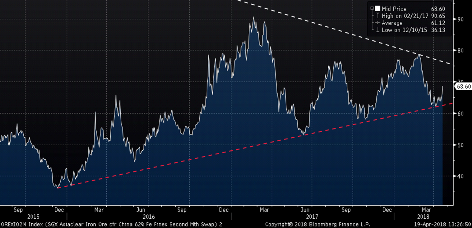 The SGX 2nd month iron ore future has bounced nicely off its multi-year uptrend line (red dashed) as rebar and a number of global commodities (oil, copper, aluminum, nickel) have rallied sharply over the past few trading days.