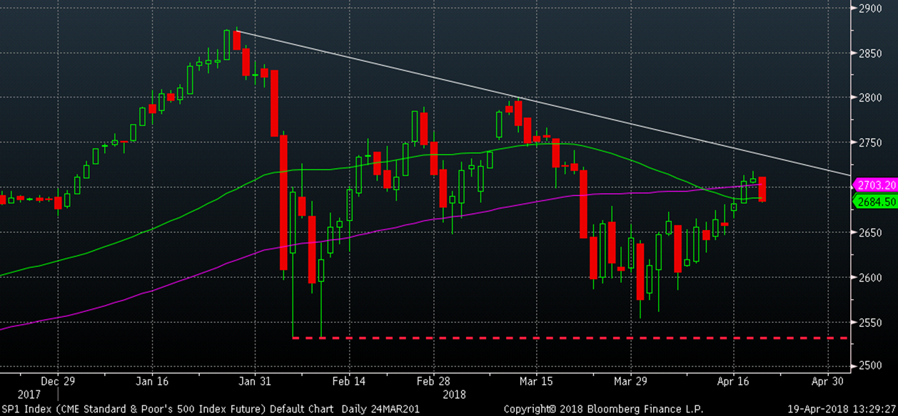 The stock market traded up to the down trendline yesterday and has thus far failed to break above it. Not a great sign for the market and if it goes back into sell off mode, watch the 2530 (red dashed line) level. If the S&P 500 closes below that level, the market is likely in for a serious correction.