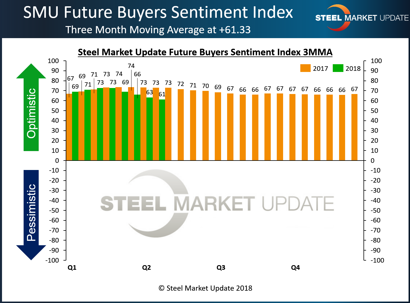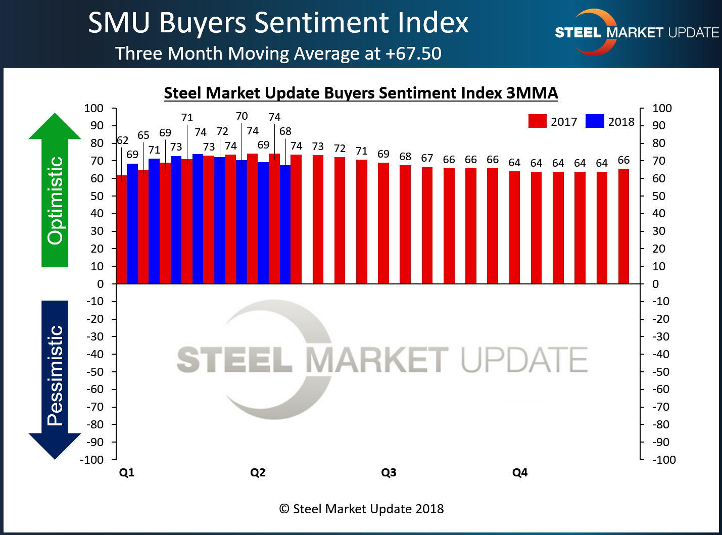 Both current and future sentiment among flat rolled steel buyers remain at optimistic levels, though buyers’ confidence appears to have seen some erosion as measured by the three-month moving averages in Steel Market Update’s Steel Buyers Sentiment Index. The index is designed to measure changes in buyers’ attitudes, which offers insight into their likely decision-making. Customer resistance to high steel prices and uncertainty over Trump administration trade actions may be taking a toll on buyers’ emotions.