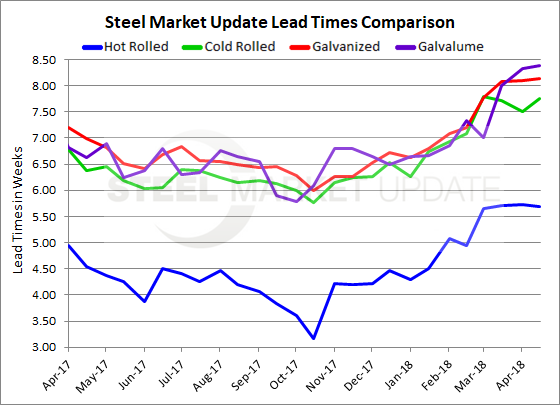 Galvanized lead times topped eight weeks in mid-March and registered 8.13 weeks in the latest data. The lead time for Galvalume moved up to 8.38 weeks from 8.00 weeks one month ago.