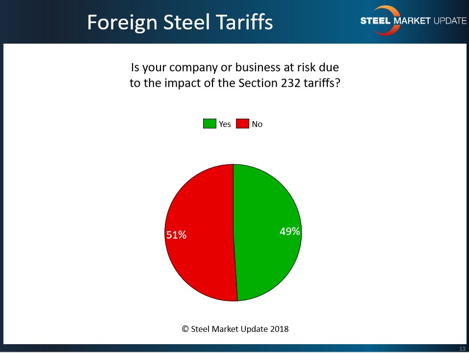 Industry executives responding to Steel Market Update’s April 16 flat rolled market trends questionnaire are almost evenly split on whether the Trump administration tariffs will help or hurt their businesses. Fifty-two percent say their business is not at risk, while 48 percent feel it is.