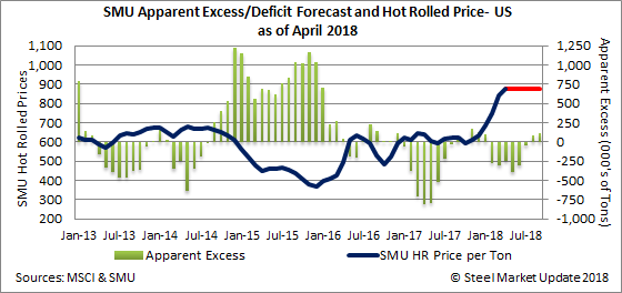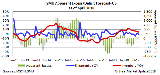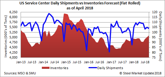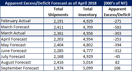 With the change in our model, our new forecast is for U.S. service centers to be holding a deficit of -253,100 tons through the end of April and for that deficit to remain at that level throughout June, before shrinking. We have the service centers returning to “balanced” inventories by the end of July 2018.