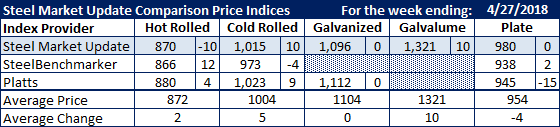 The three indexes split on cold rolled. Platts and SMU saw CRC as higher while SteelBenchmarker was $50 per ton below Platts…