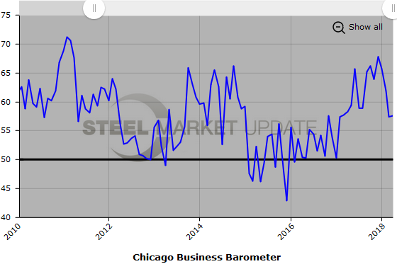 Below is a graph showing the history of the Chicago Business Barometer. You will need to view the graph on our website to use its interactive features; you can do so by clicking here. If you need assistance logging in to or navigating the website, please contact Brett at 706-216-2140 or Brett@SteelMarketUpdate.com.