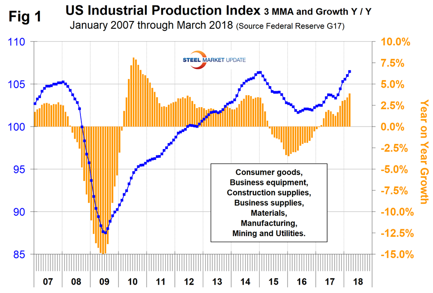 The Industrial Production Index: Figure 1 shows the IP index since January 2007 with the year-over-year growth. The three-month moving average (3MMA) had negative growth every month from October 2015 through December 2016 as shown by the brown bars in Figure 1. January 2017 was the first month of positive growth in the 3MMA since August 2015. Growth has improved on a year-over-year basis every month since September 2017. Manufacturing capacity utilization improved from 74.57 in March last year to 75.61 in March 2018, also on a 3MMA basis.