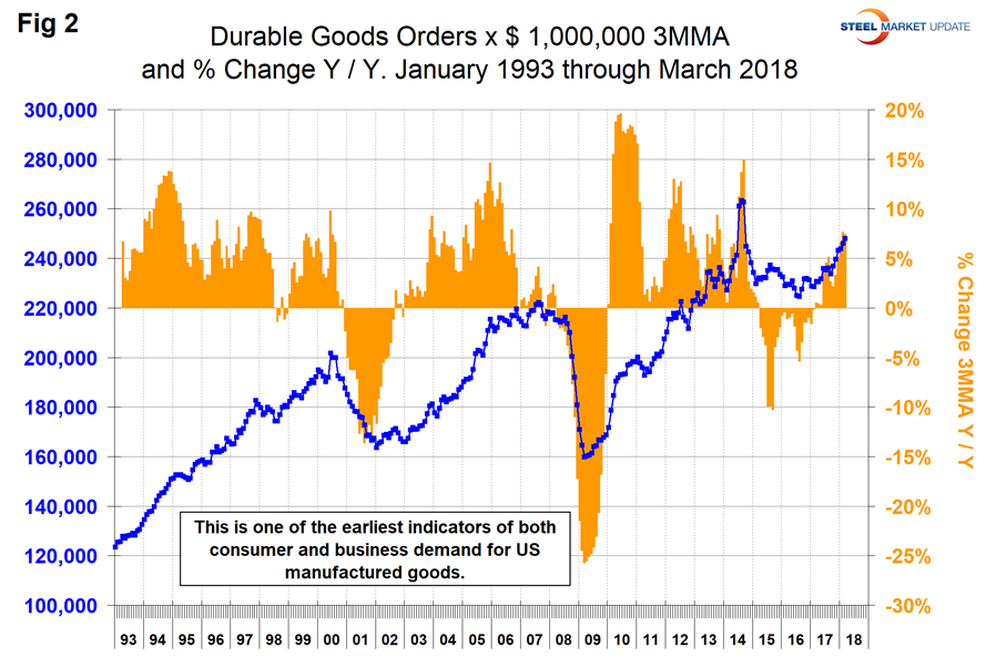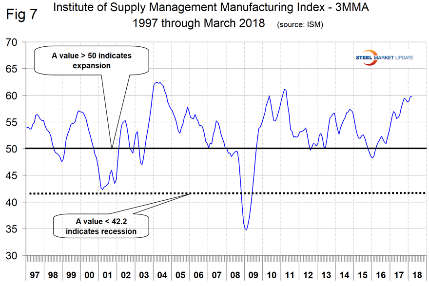 The ISM Manufacturing Index: The Institute for Supply Management’s Manufacturing Index is a diffusion index. ISM states: “Diffusion indexes have the properties of leading indicators and are convenient summary measures showing the prevailing direction of change and the scope of change. An index value above 50 percent indicates that the manufacturing economy is generally expanding; below 50 percent indicates the opposite.” Figure 7 shows the 3MMA of the ISM index from January 1997 through March 2018 with an improving trend since January 2016. In March, the 3MMA of the index at 59.73 was unchanged since February and the highest since April 2011.