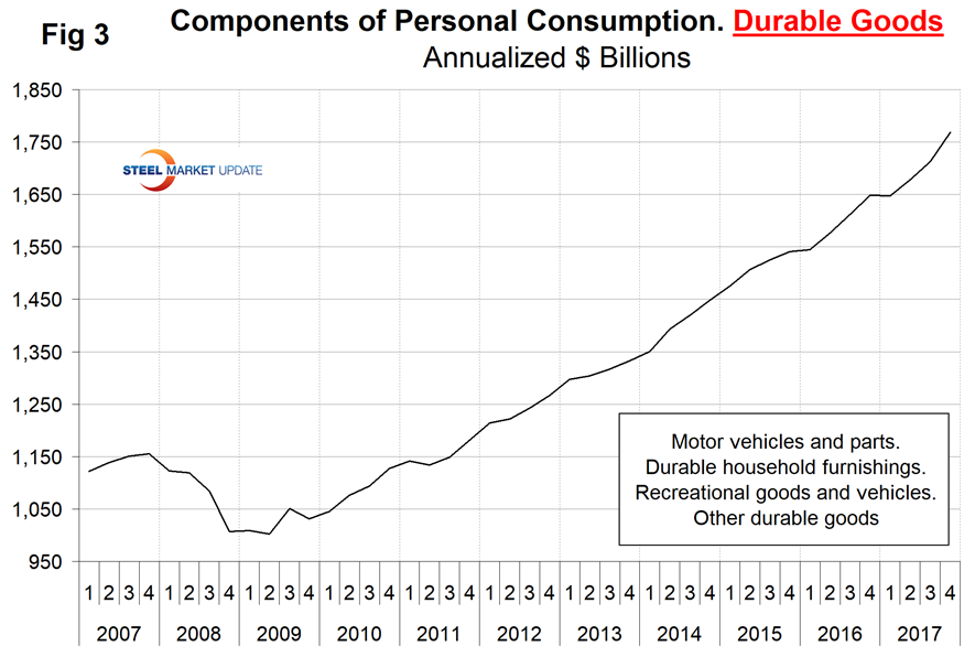 The Durable Goods Portion of GDP: The third estimate of Q4 2017 GDP came in at 2.87 percent annualized growth, which was down from 3.16 percent in Q3. A subcomponent of the quarterly data is durable goods, which is part of the personal consumption calculation. It therefore contains no military hardware or civil aircraft data. This is shown in Figure 3 and, presumably because of the exclusions just mentioned, looks nothing like Figure 2. Except for one quarter, Q1 2017, the durable goods portion of GDP has had positive growth every quarter since Q2 2011 and in Q4 2017 was 3.25 percent.