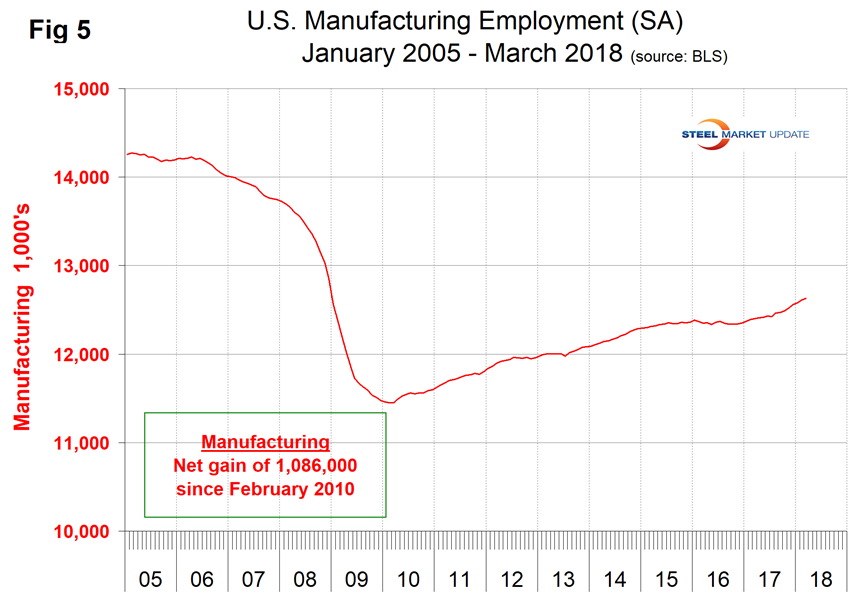 Manufacturing Employment: Manufacturing employment plummeted during the recession and gradually improved from the spring of 2010 through 2014. Growth was flat in 2015 and declined slightly in 2016 when 23,000 jobs were lost during the year as a whole. There was a turnaround in 2017, and in the eight months August 2017 through March 2018 208,000 jobs were created in manufacturing (Figure 5). The motor vehicles and parts subcomponent of manufacturing employment had a net gain of 34,000 in the same time frame.