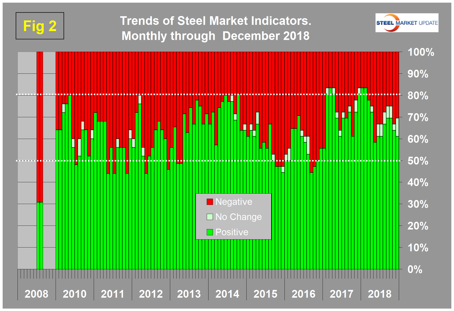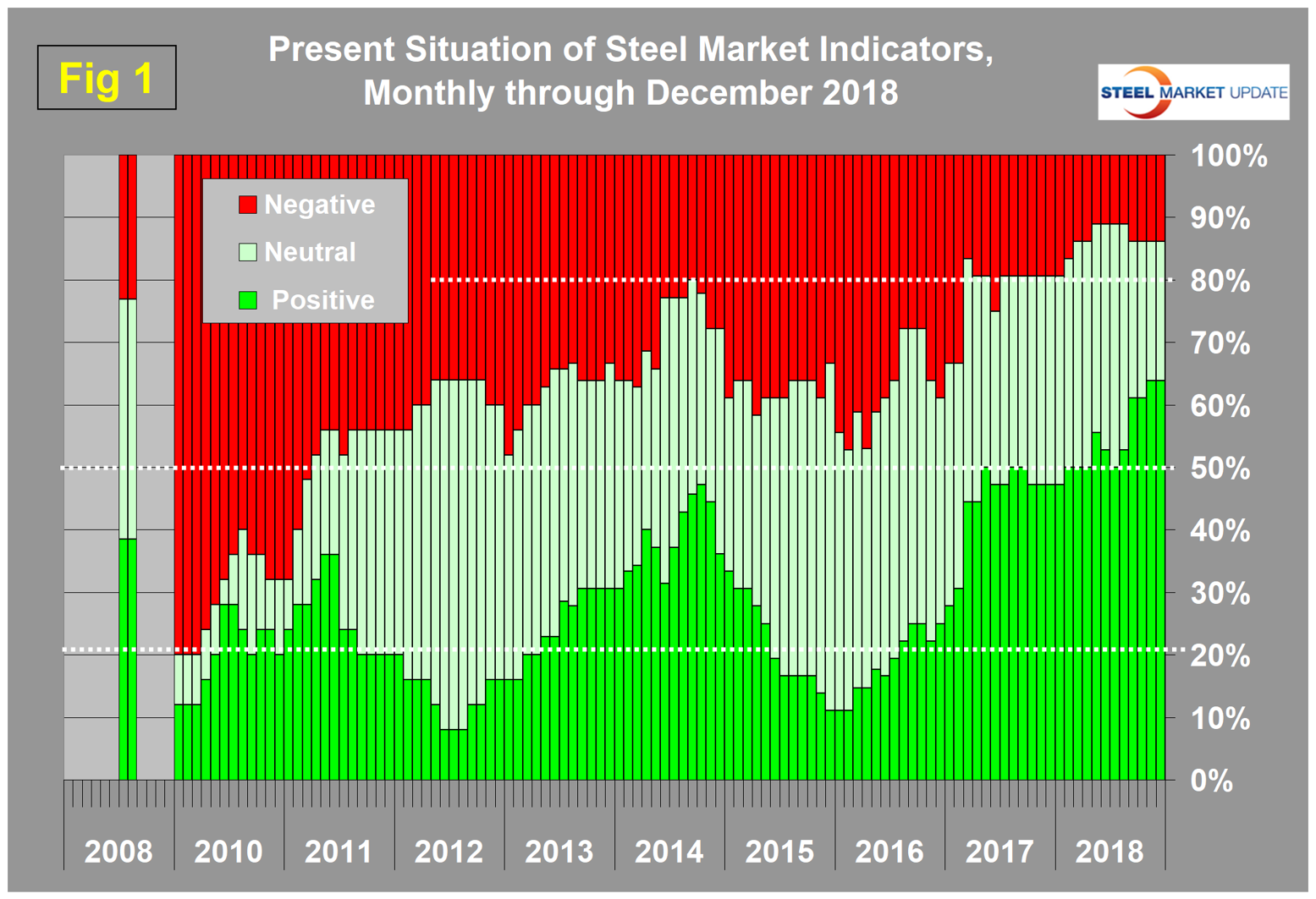 This report summarizes 36 data streams that we believe critically describe the state of and provide forward guidance for the steel market. Data released in December shows that 24 of the 36 indicators are historically positive with only five negative. The balance are within the band of historically normal. Trends took a small step back since November, falling from 23 positive to 22 positive in December.