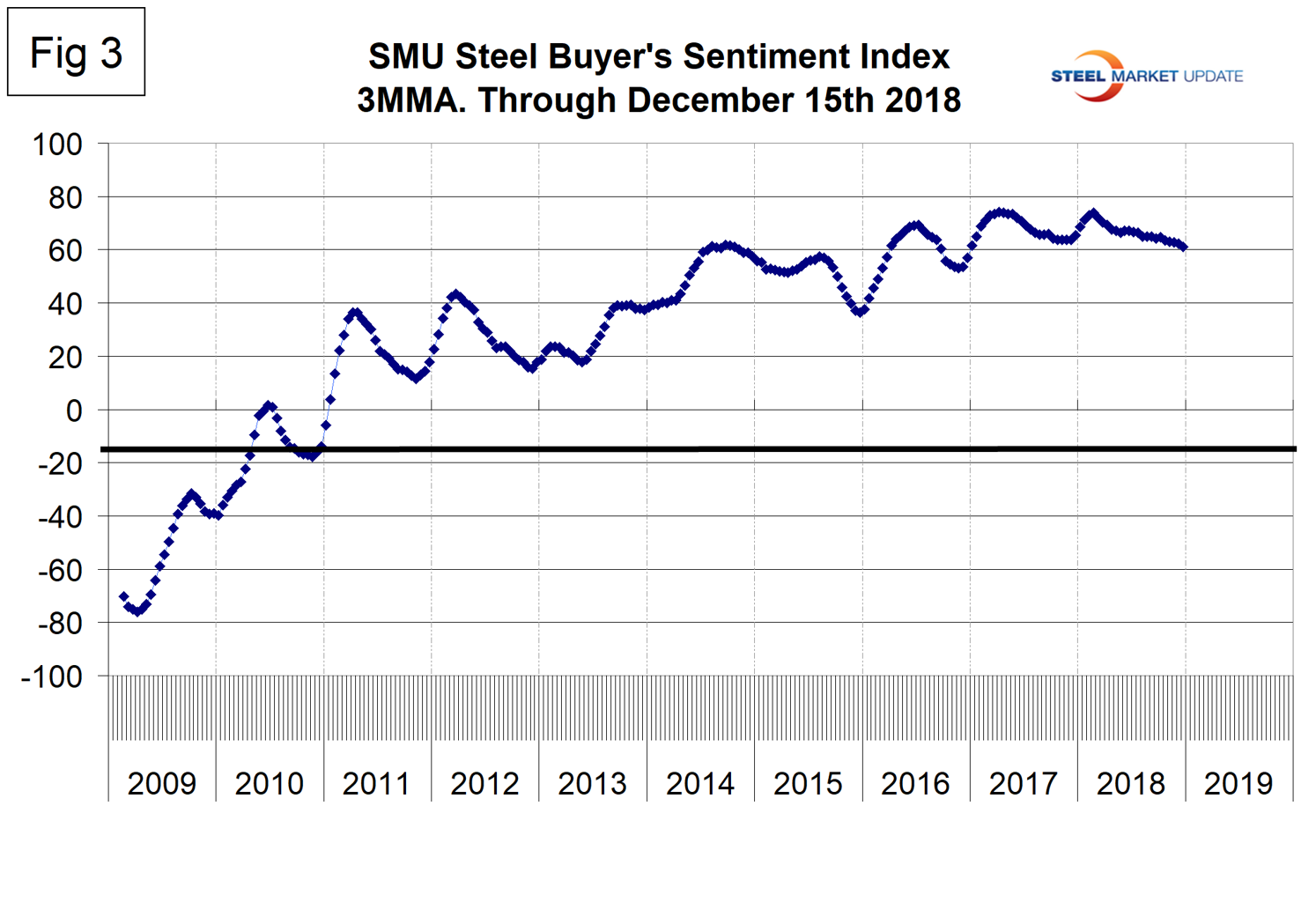 The SMU Steel Buyers Sentiment Index is a measure of the current attitude of buyers and sellers of flat rolled steel products in North America. It reports on how they feel about their company’s opportunity for success in today’s market. This index is still strong, but declined in both November and December, continuing a steady decline since the peak in mid-February (Figure 3).