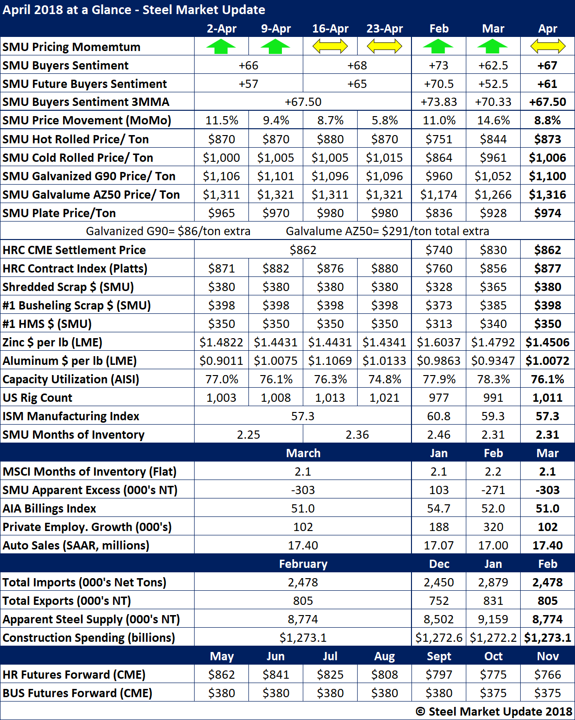 Steel shipments continue strong in the second quarter as seasonal demand picks up. Buyers sentiment remained at optimistic levels ahead of the Trump administration’s decision May 1 on steel tariffs. Late yesterday, the administration announced that it would extend some tariff exemptions for another month to give countries more time to negotiate quotas or other import measures.