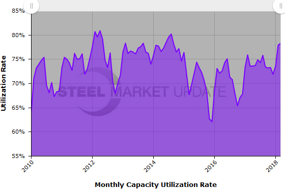 The mill capacity utilization rate for March 2018 was 78.3 percent, up from 77.9 percent in February, and up from 73.6 percent one year ago. This is the highest rate since August 2014, back when 8,546,303 tons were produced at a capcity utilization rate of 80.2 percent.