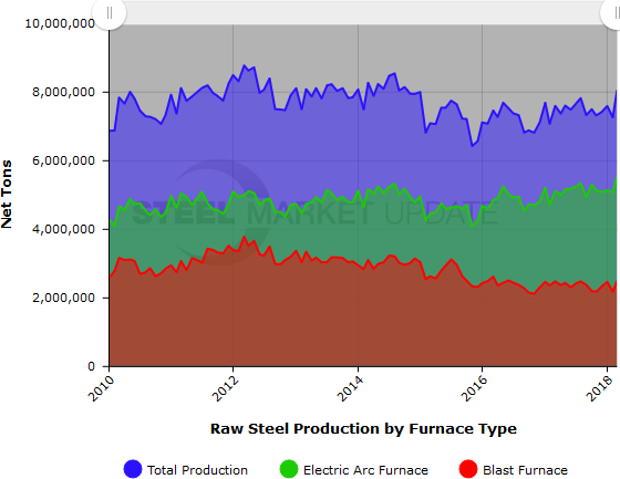 The chart below shows total monthly steel production (blue) broken down by electric arc furnace production (green) and blast furnace production (red).