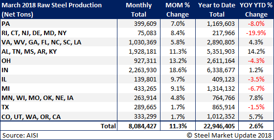 Total raw steel production for the month of March was 8,084,427 net tons, the highest production level since October 2014 when 8,147,661 tons were produced. The production method breakdown was 5,578,866 tons produced by electric arc furnaces (EAFs) and 2,505,561 tons produced by blast furnaces. March raw steel production was 818,072 tons or 11.3 percent higher than February, and 485,074 tons or 6.4 percent higher than the same month last year, reports the American Iron and Steel Institute (AISI) in Washington. AISI’s monthly estimates are different than the weekly estimates we report; the monthly estimates are based on over 75 percent of the domestic mills reporting versus only 50 percent reporting for the weekly estimates.