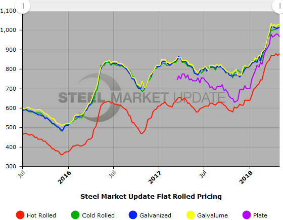 SMU Note: Below is a graphic showing our hot rolled, cold rolled, galvanized, Galvalume, and plate price history. This data is available here on our website with our interactive pricing tool. Note that plate prices are not yet available on our website, but we are in the process of adding that dataset. If you need help navigating the website or need to know your login information, contact us at info@SteelMarketUpdate.com or 800-432-3475.